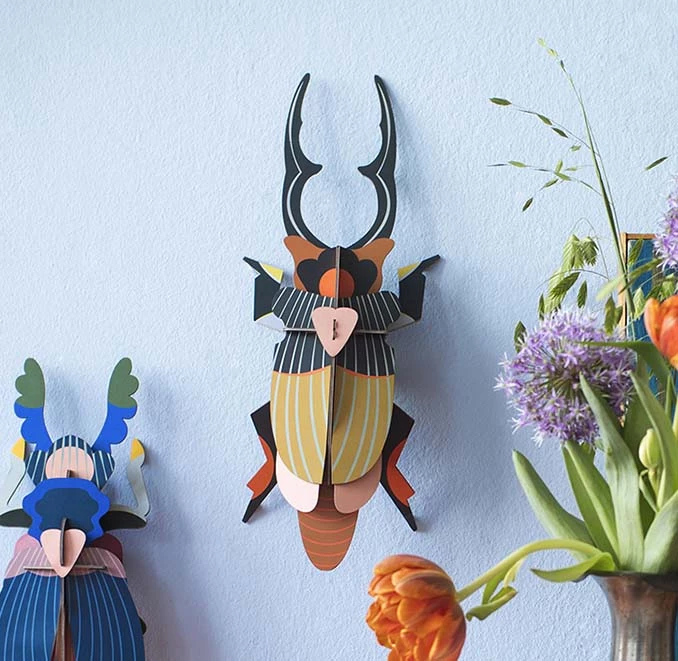 In real animal life, they inconspicuously scuttle about under leaves and on branches, but these flamboyant and colourful beetles – from every corner of the world – look as if they have just stepped off the catwalk. Give them a place among your artistic treasures, hang them on the wall, let them crawl around on your table and create your own insect story.3D object to build, comes flatpacked. Made of recycled cardboard and printed with vegetable inks.