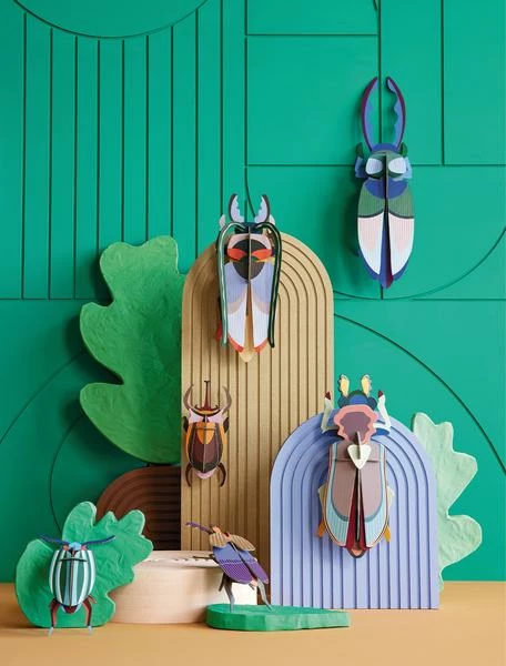 In real animal life, they inconspicuously scuttle about under leaves and on branches, but these flamboyant and colourful beetles – from every corner of the world – look as if they have just stepped off the catwalk. Give them a place among your artistic treasures, hang them on the wall, let them crawl around on your table and create your own insect story. 3D object to build, comes flatpacked; Made of recycled cardboard and printed with vegetable inks; Dimensions when built up: 10x7x39.5cm / 3.4×2.8×15.5″ ; 2 x A4 sheet with 9 pieces to pop out and assemble; Assembly instructions can be found on the inside of the packaging.