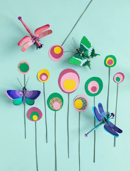 Imagine yourself as an explorer, a scientist or an artist and be inspired by these wonderful butterflies and dragonflies. Build the butterflies and dragonflies, play with them and hang them on the wall as decoration. 3D object to build, comes flatpacked; Made of recycled cardboard and printed with vegetable inks; Dimensions when built up: 14x6x15 cm / 5.5×2.4×6” ; 4 x B6 sheet with 13 pieces to pop out and assemble; Assembly instructions can be found on the inside of the packaging.