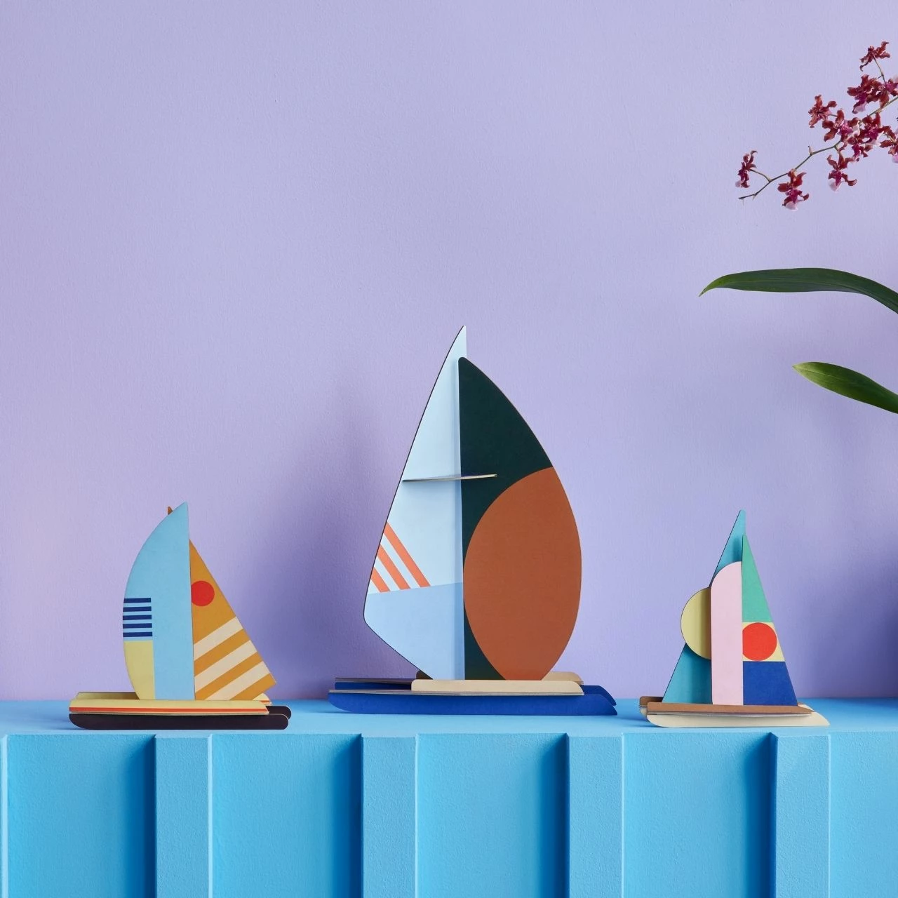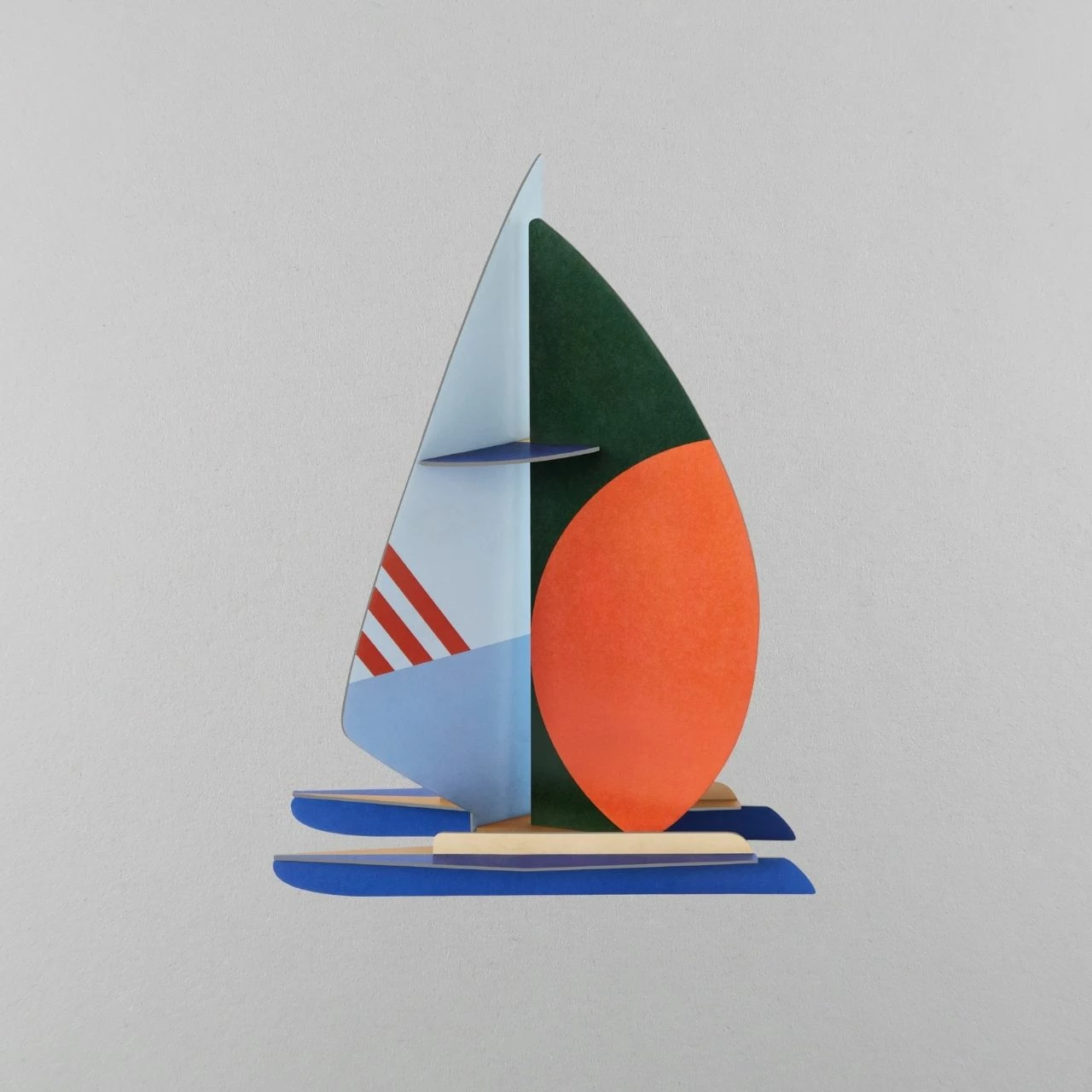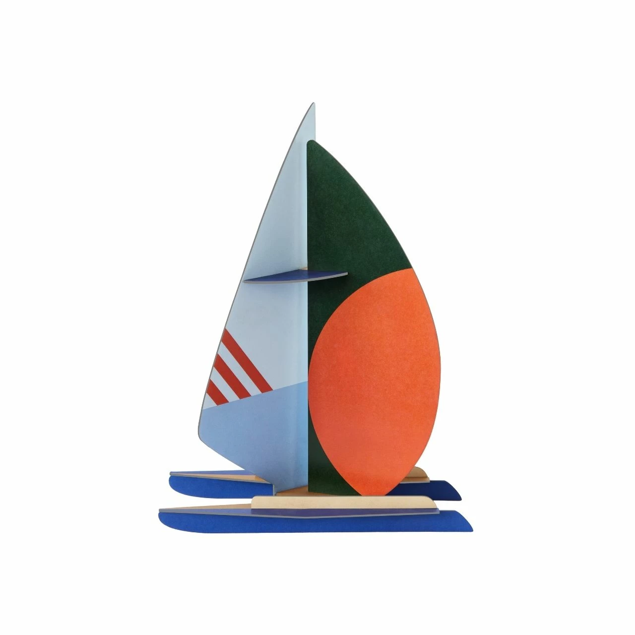This Giant Catamaran is one of several new designs from Studio Roof. Made from recycled cardboard & printed wth vegetable inks, there are 6 pieces to pop out and assemble. The finished item will look good on a mantlepiece or shelf, but I wouldn’t try and sail it!