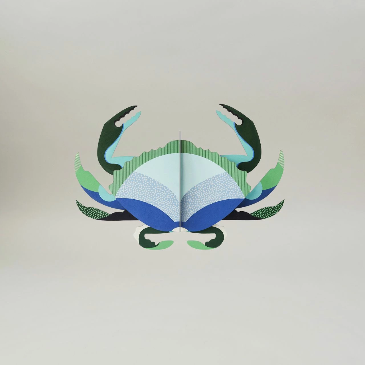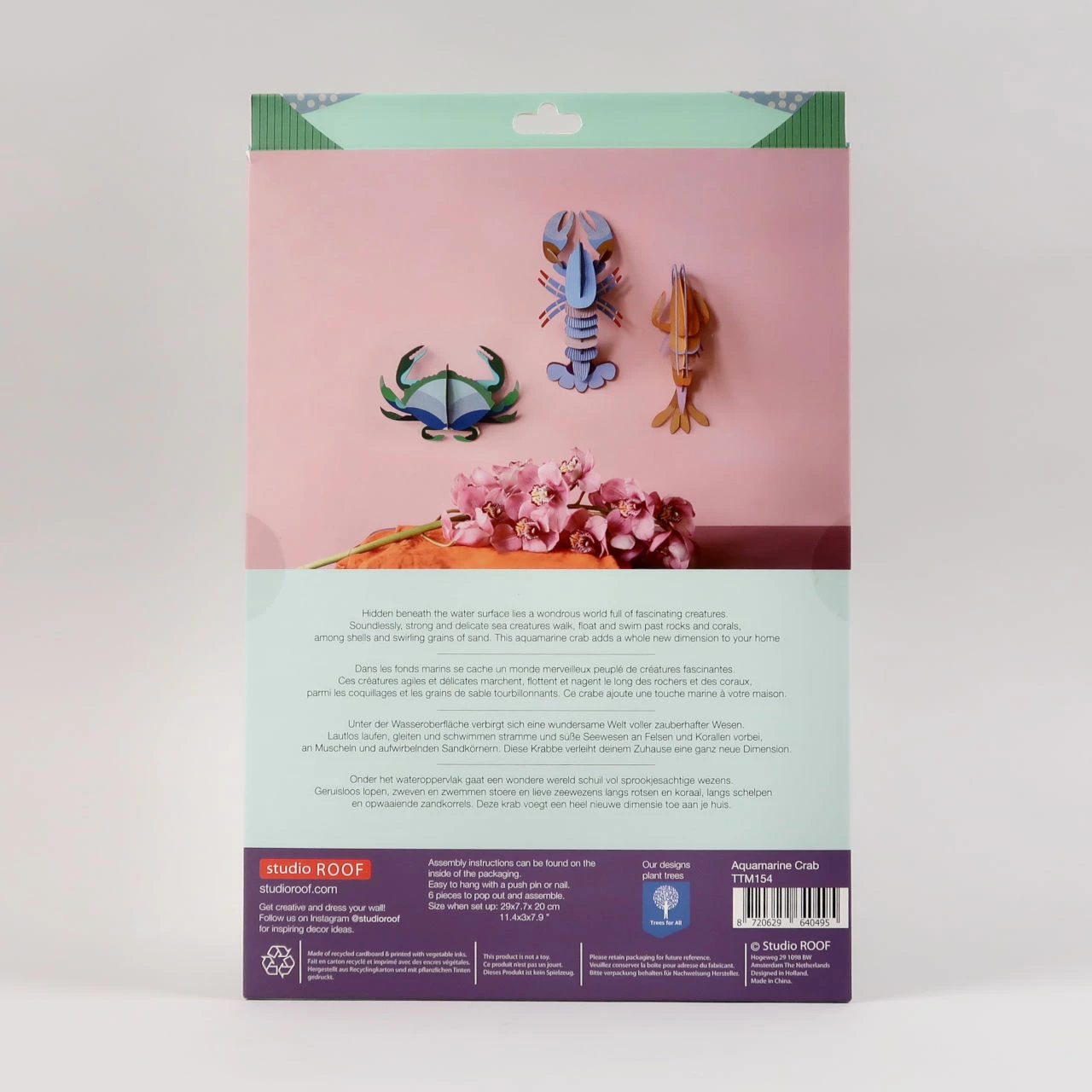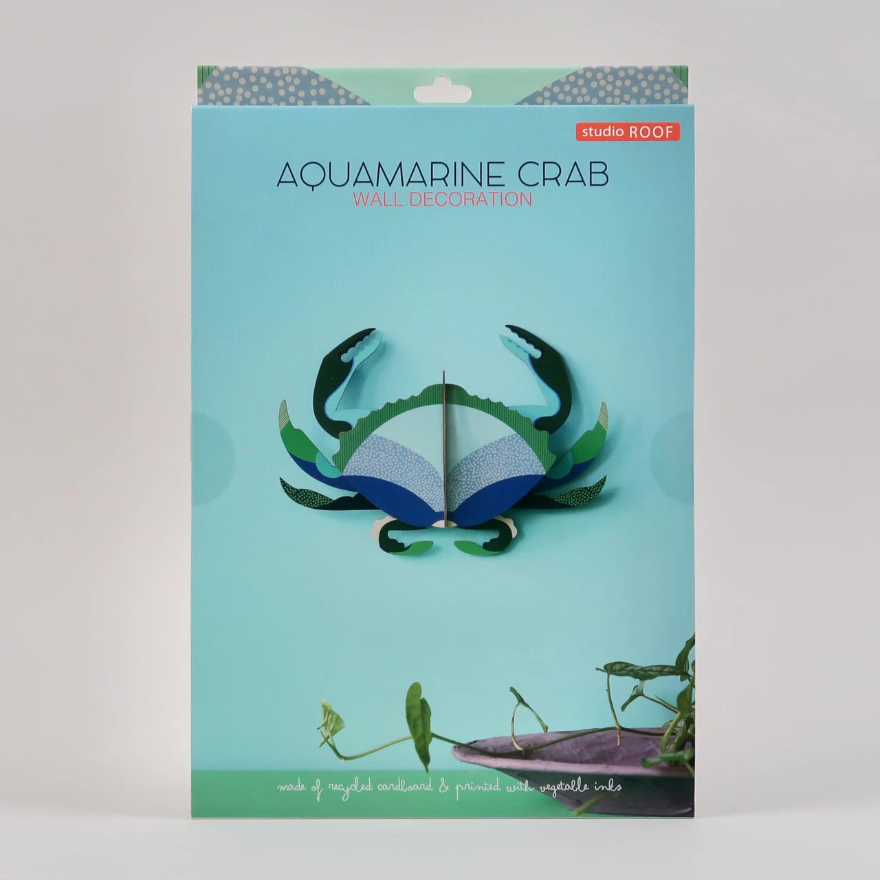 The aquamarine crab comes flat packed and then needs assembling. It can be hung on the wall and would make a great decoration for a child’s bedroom or a garden office or studio.