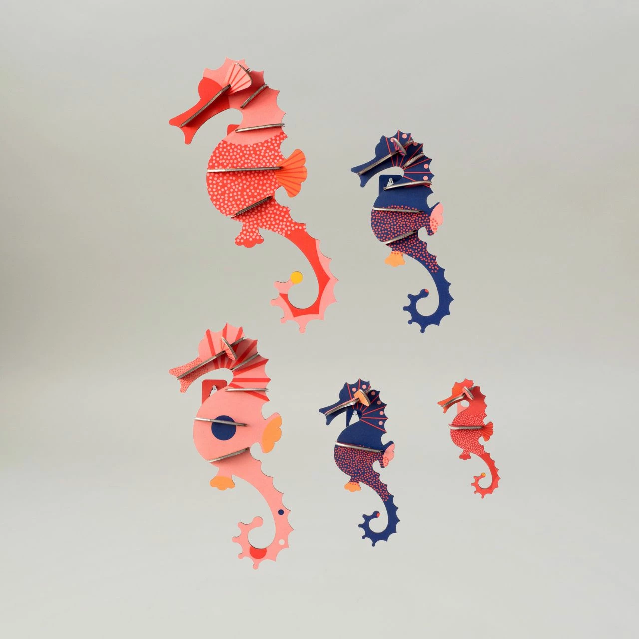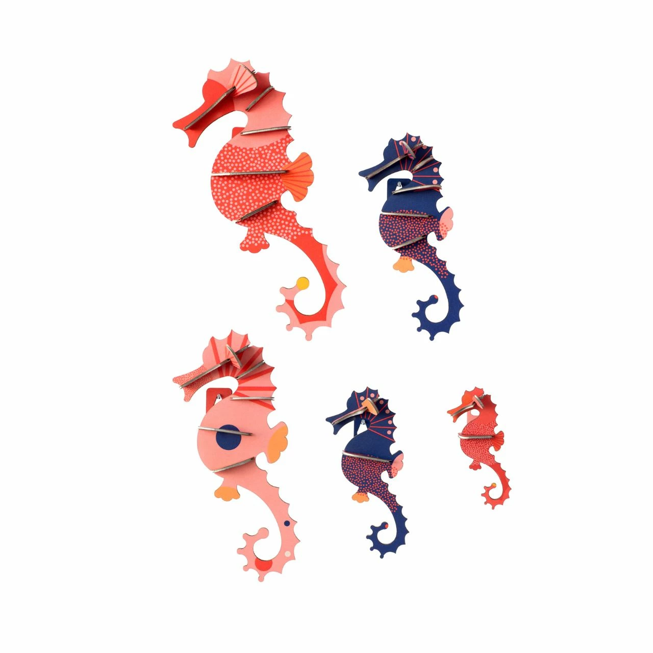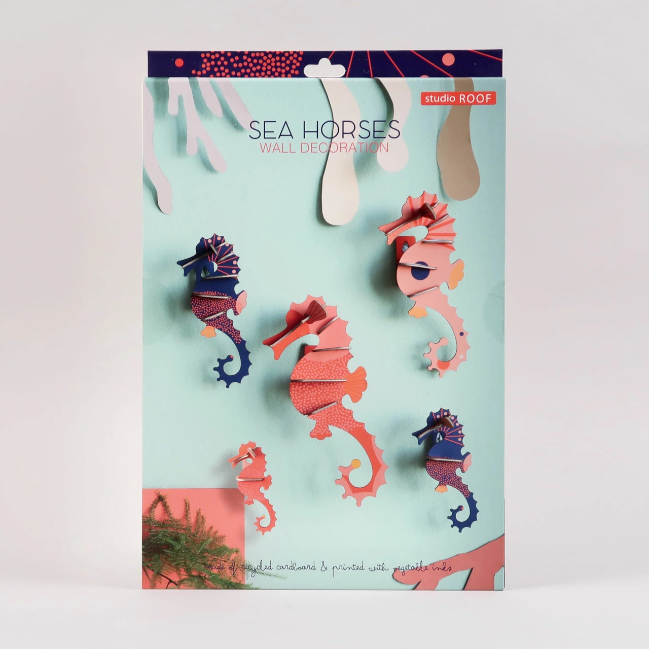 The five separate seahorses come flat packed and then need assembling. They can be hung on the wall and would make a great decoration for a child’s bedroom ora garden office or studio.