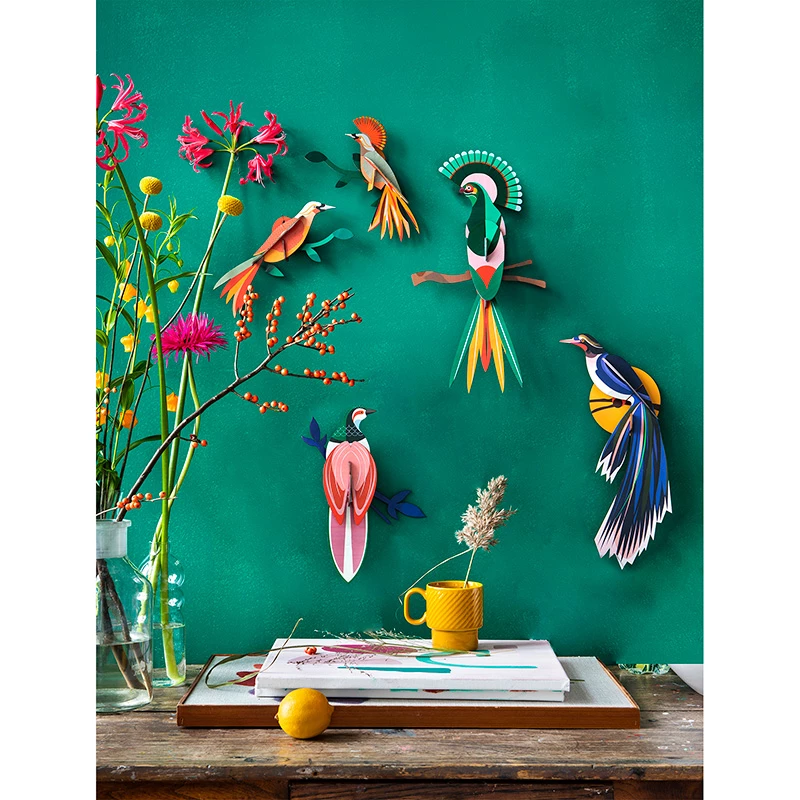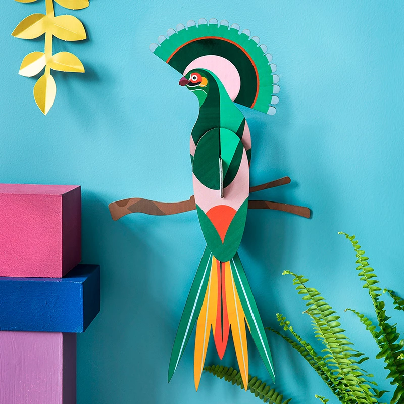 Special treasures for your home from Studio Roof. These birds of paradise made of recycled cardboard have colorful and striking graphic patterns. Enjoy the process of watching these beautiful creations come to life, Studio Roof cardboard pieces are easy to assemble. Have your own little piece of paradise on your wall.