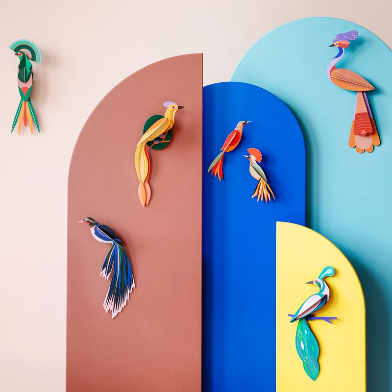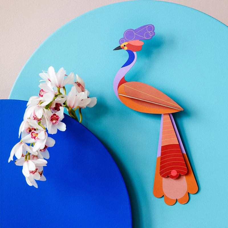 Special treasures for your home from Studio Roof. These birds of paradise made of recycled cardboard have colorful and striking graphic patterns. Enjoy the process of watching these beautiful creations come to life, Studio Roof cardboard pieces are easy to assemble. Have your own little piece of paradise on your wall.
