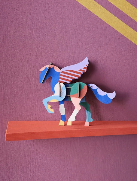 Oh, winged stallion, shall we gallop to magical places together? Mythical figures from times long gone and unforgettable legends come to life in cardboard. Put the Pegasus together and play your own story. 3D object to build, comes flatpacked;Made of recycled cardboard and printed with vegetable inks;Dimensions when built up: 18,5×4,5×15,5 cm / 7,3×1,8×6,1″;2 x B6 sheet with 15 pieces to pop out and assemble;Assembly instructions can be found on the inside of the packaging.REF TTM163
