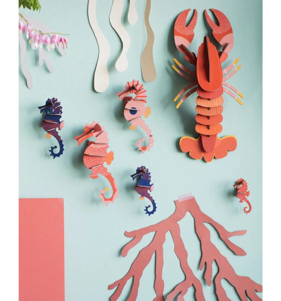 Hidden beneath the water surface lies a wondrous world full of fascinating creatures. Soundlessly, strong and delicate sea creatures like lobsters and sea horses walk, float and swim past rocks and corals, among shells and swirling grains of sand. These sea horses add a whole new dimension to your home. 3D object to build, comes flatpacked; • Made of recycled cardboard and printed with vegetable inks • Dimensions when built up: 17 x 10 x 39 cm •2 x A4 sheets with 17 pieces to colour, pop out and assemble •Assembly instructions can be found on the inside of the packaging