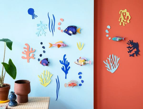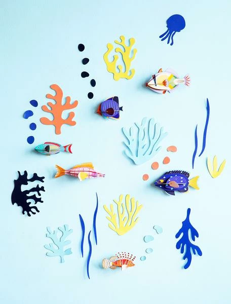 Turn yourself into a nature explorer and investigate different fauna and flora from around the world! Unwrap a surprise chest full of pop-out cardboard animals and paper leaves and build up a magnificent world on your walls. Bubbling their way up from salty seas and freshwater lakes, these fishes and seaweed are happy to turn your rooms into an aquatic paradise! 3D objects to build, come flatpacked; Assembly instructions can be found inside of the packaging. Included are 6 fish and 10 pieces of pop-out seaweed, as well as somedouble-sided foam tape to place the seaweed on the wall;Made of recycled cardboard and printed with vegetable inks;Dimensions of the biggest fish when built up: 18x7x11 cm – 7×2.8×4.3” ;4 x A4 cardboard sheet with 28 pieces to pop out and assemble and 4 x A4 paper sheet with 10 pieces of seaweed to pop out;Assembly instructions can be found inside of the packaging.